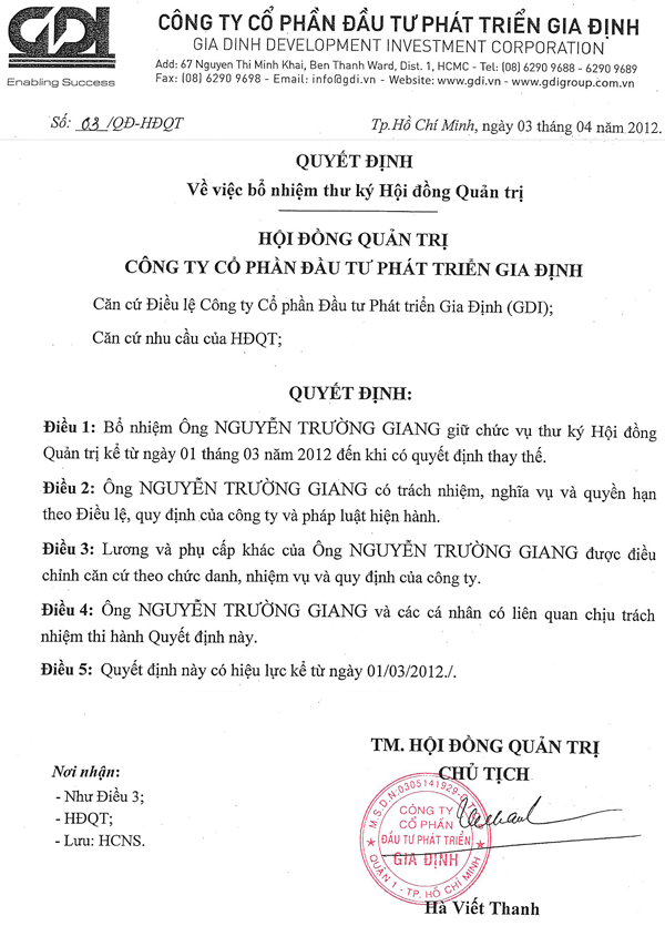 Quyết Định Bổ Nhiệm Phó Tổng Giám Đốc Công Ty CP Đầu Tư Phát Triển Gia Định đối với Ông Lê Anh